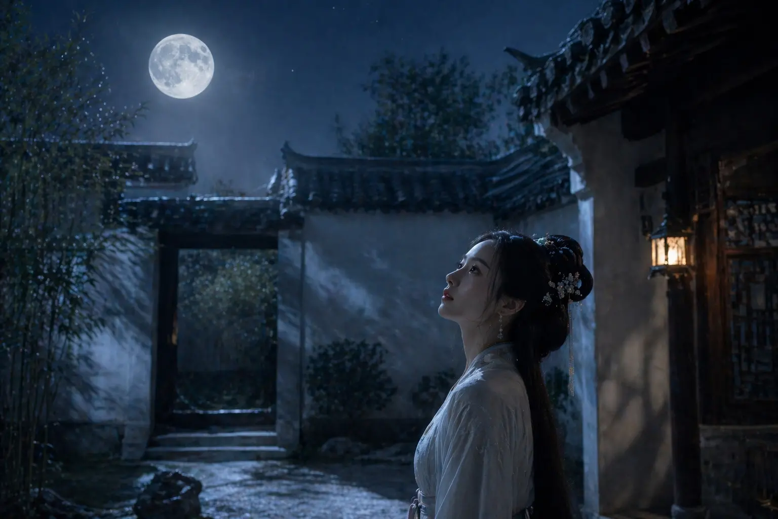 测试prompt: “李白《静夜思》意境:床前明月光,疑是地上霜。一位古风女子在唐代庭院里抬头望月,月光洒在青砖白墙,水墨意境与现实光影自然融合,电影级氛围。”