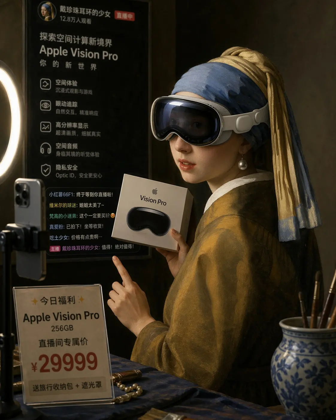 1.《戴珍珠耳环的少女》正在戴着最新的 Apple Vision Pro 进行直播带货。