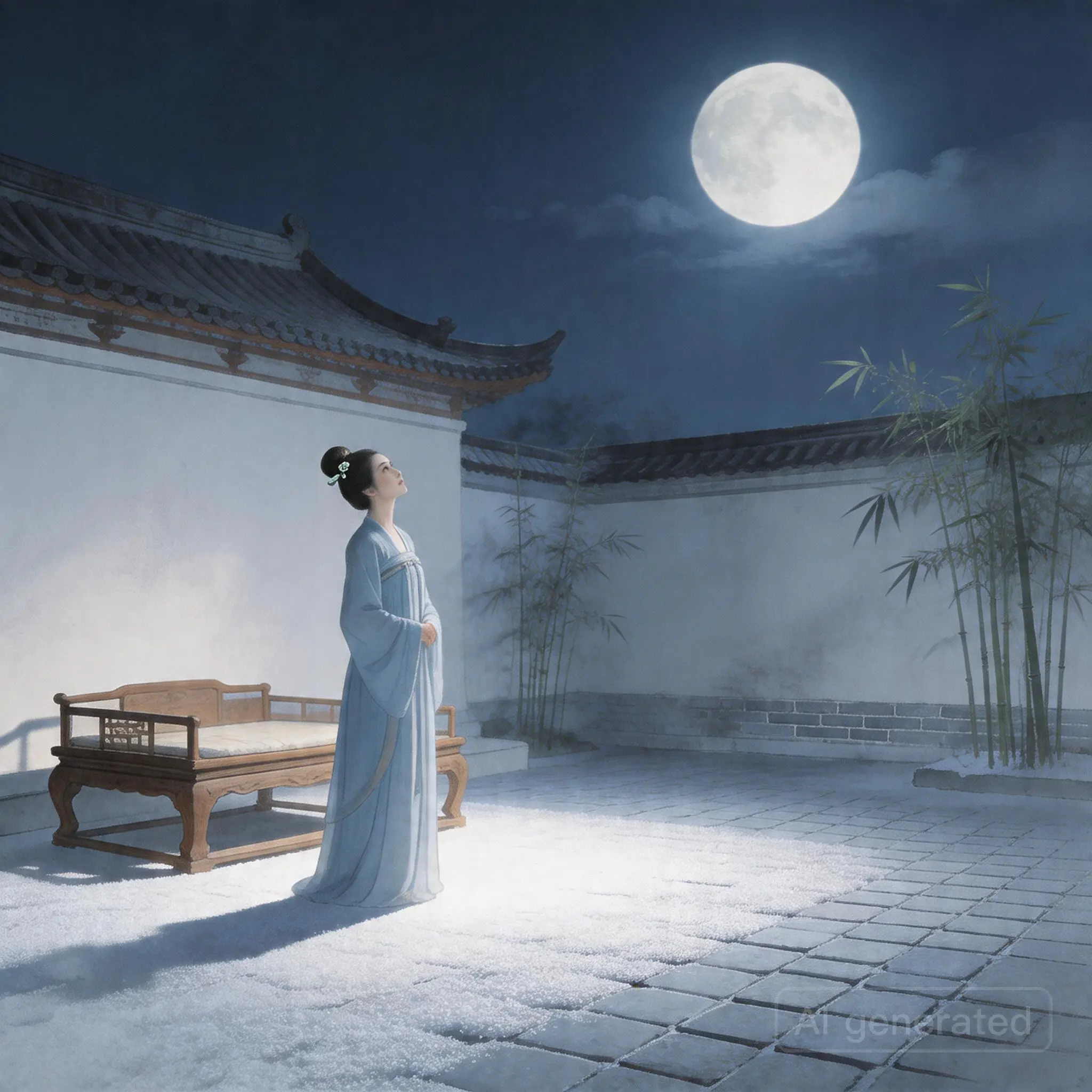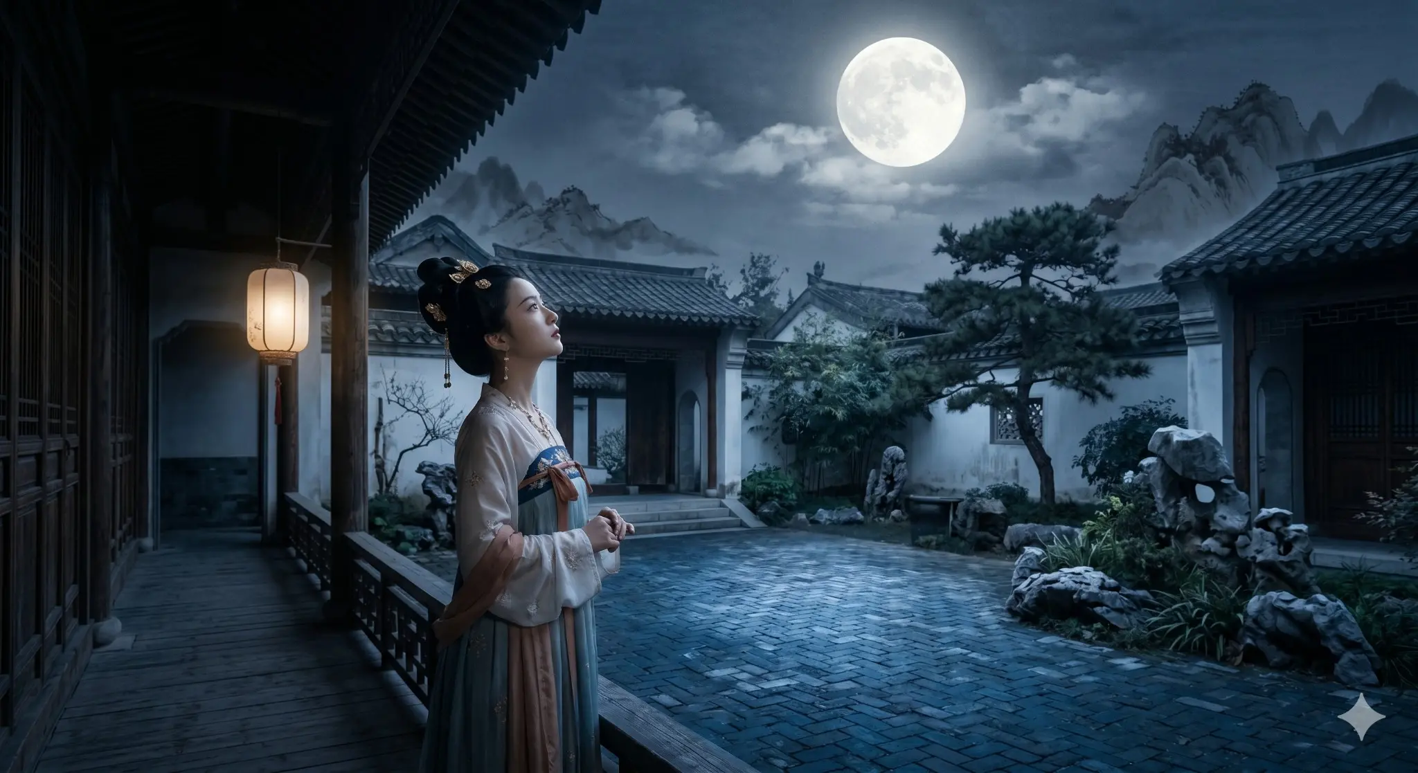 Seedream 5.0 Lite :优秀。水墨意境与现实光影融合自然出色。古风女子在唐代庭院抬头望月,月光洒落青砖白墙,地面“疑是地上霜”效果清晰,成功还原《静夜思》清冷诗意,古典氛围与电影级光影细腻优雅,文化韵味浓厚。