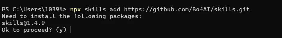 系统会提示你需要安装 skills@1.4.9(版本号可能会更新)基础包,输入 y 确认继续,随后系统开始自动克隆资源库。