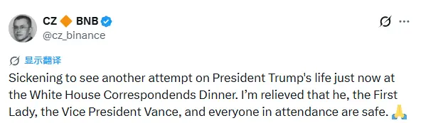 赵长鹏在 X 平台发文表示,“看到刚刚在白宫记者晚宴上再次出现针对总统特朗普的袭击企图,真令人作呕。所幸他、第一夫人、副总统万斯以及所有在场人员都平安无事。”
