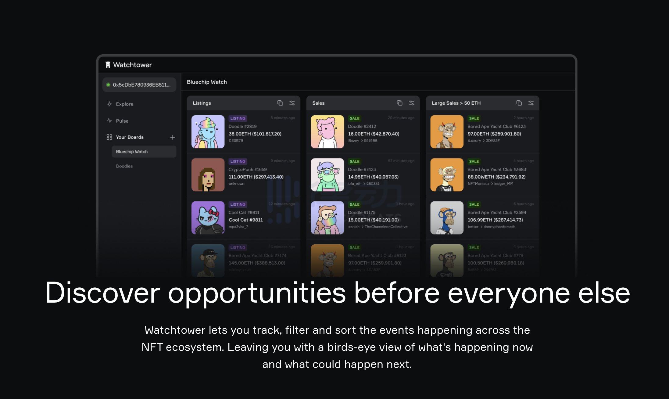 Watchtower allows NFT investors and traders to track, filter, and categorize events occurring throughout the NFT ecosystem to better discover, evaluate, and capitalize on potential market investment opportunities.