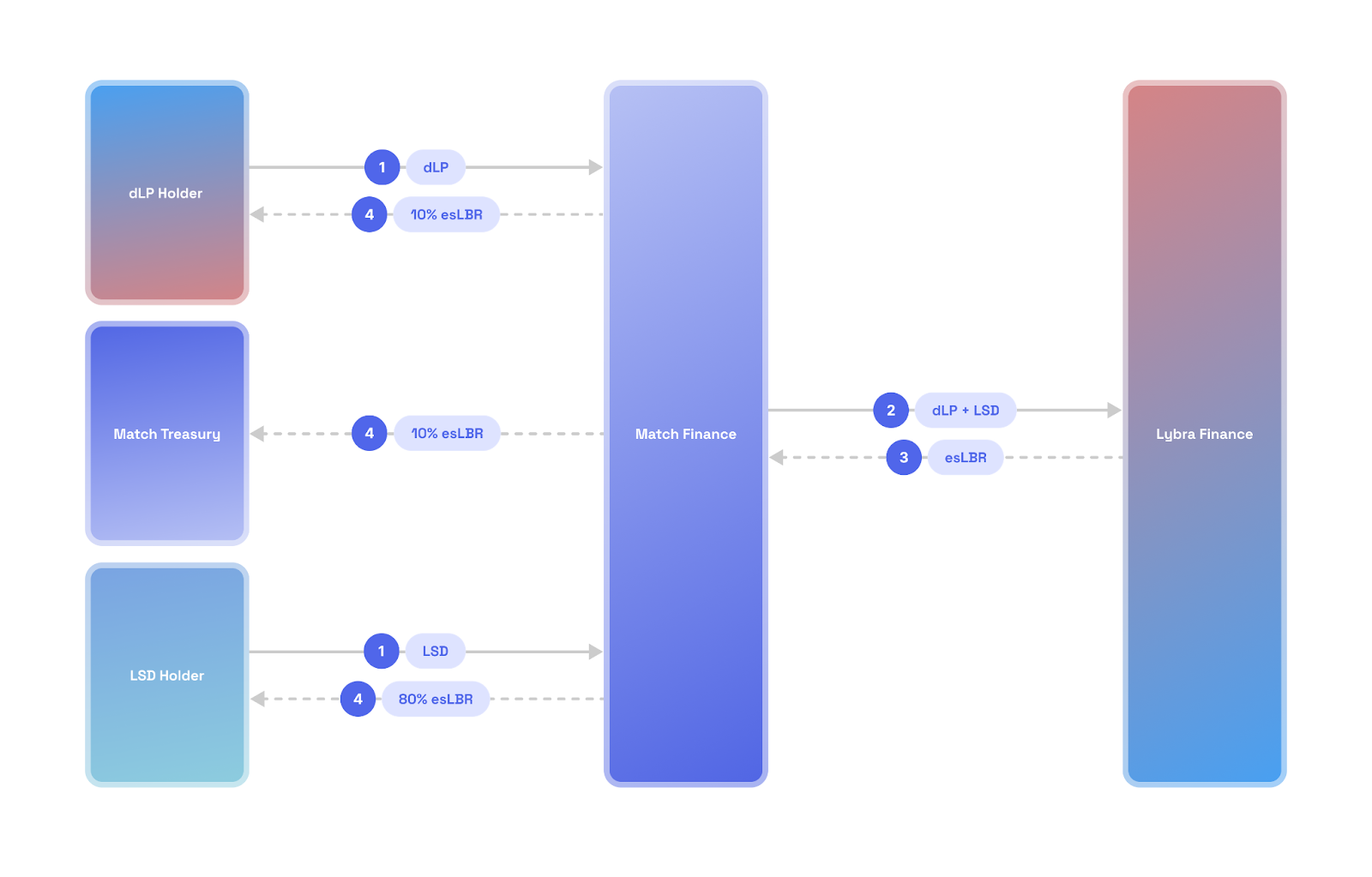 In Lybra Finance, users must maintain 5% of the total value of eUSC in LBR/ETH liquidity to earn esLBR rewards. If they fail to maintain this, the esLBR they could have earned turns into a bounty. However, in Match Finance, users only need to deposit eUSD or dLP (LBR/ETH pool) to earn esLBR, significantly lowering the barrier to acquiring esLBR and reducing risk.