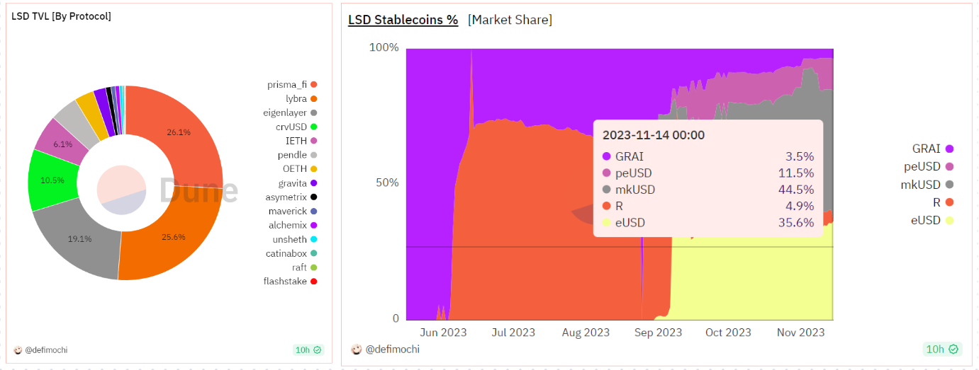 From the data, Lybra currently holds a 25.6% share in the LSDfi track, with its stablecoin eUSD accounting for 35.6% of the total track, both ranking in the top three.