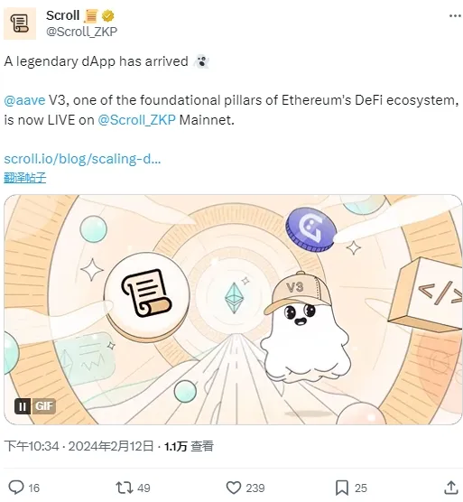 ChainCatcher news, according to official sources, Aave V3 will be launched on the Scroll mainnet. It is understood that Aave is one of the fundamental pillars of the Ethereum DeFi ecosystem.
