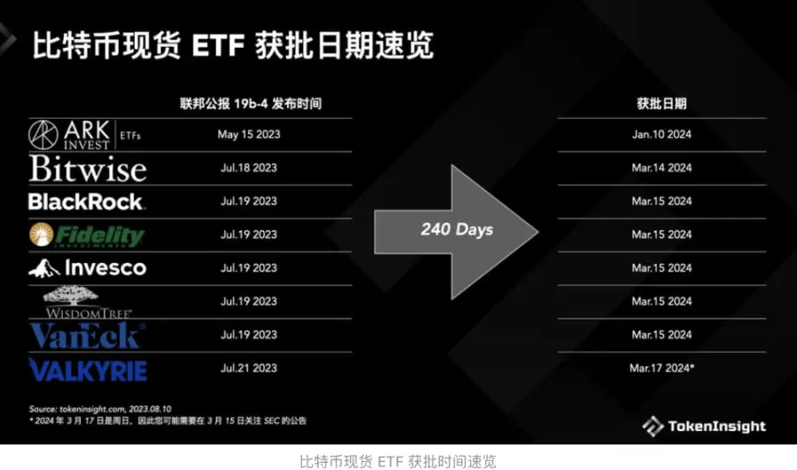 According to predictions at that time, based on the publication time of the rule change documents for each ETF application in the Federal Register, Tokeninsight predicted the possible approval times for eight institutional ETFs as follows: