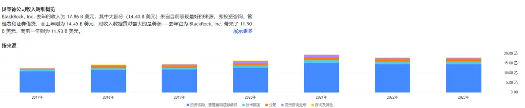 In terms of revenue, **in 2023, BlackRock's total revenue was $17.86 billion, with the largest portion ($14.4 billion) coming from investment consulting, management fees, and securities lending. The Americas region contributed the most, with **$11.9 billion in revenue in 2023. Overall, financial consulting and management fees account for the majority of the company's revenue, with U.S. companies contributing most of the income.