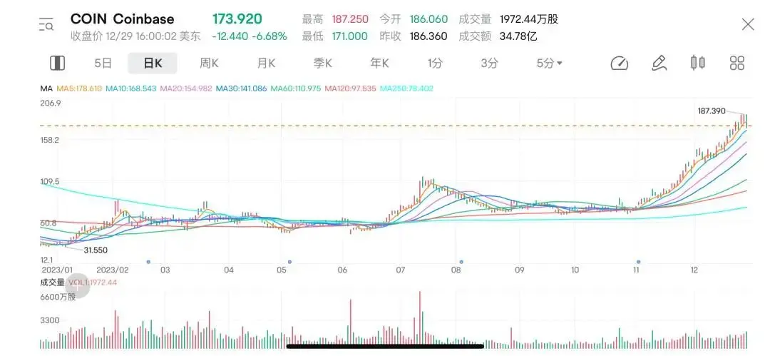 Moreover, among the companies that applied for the issuance of Bitcoin spot ETFs, five chose CEX Coinbase as the custodian, and Coinbase's price rose from $70 in October 2023 to a peak of $187 in December.