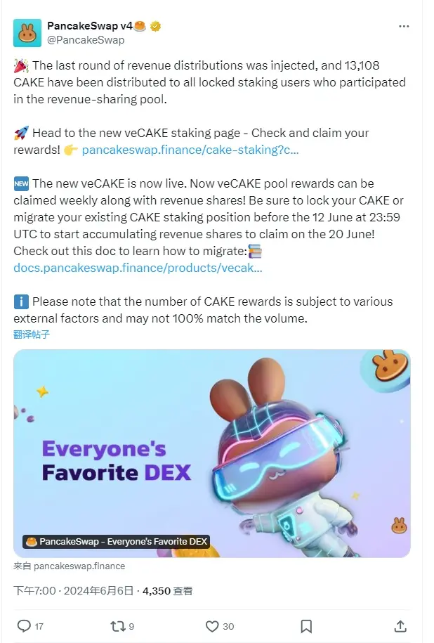 ChainCatcher message, PancakeSwap announced on platform X that it has distributed 13,108 CAKE to all locked Staking users participating in the yield sharing pool. These CAKE are from the previous round of yield distribution. Additionally, the new veCAKE is now live, and you can visit the new veCAKE staking page to view and claim tokens. It supports weekly claims for veCAKE pool rewards and yield shares. To claim in the next cycle, you need to lock CAKE or migrate your existing CAKE staking position before June 12 at 23:59 UTC.