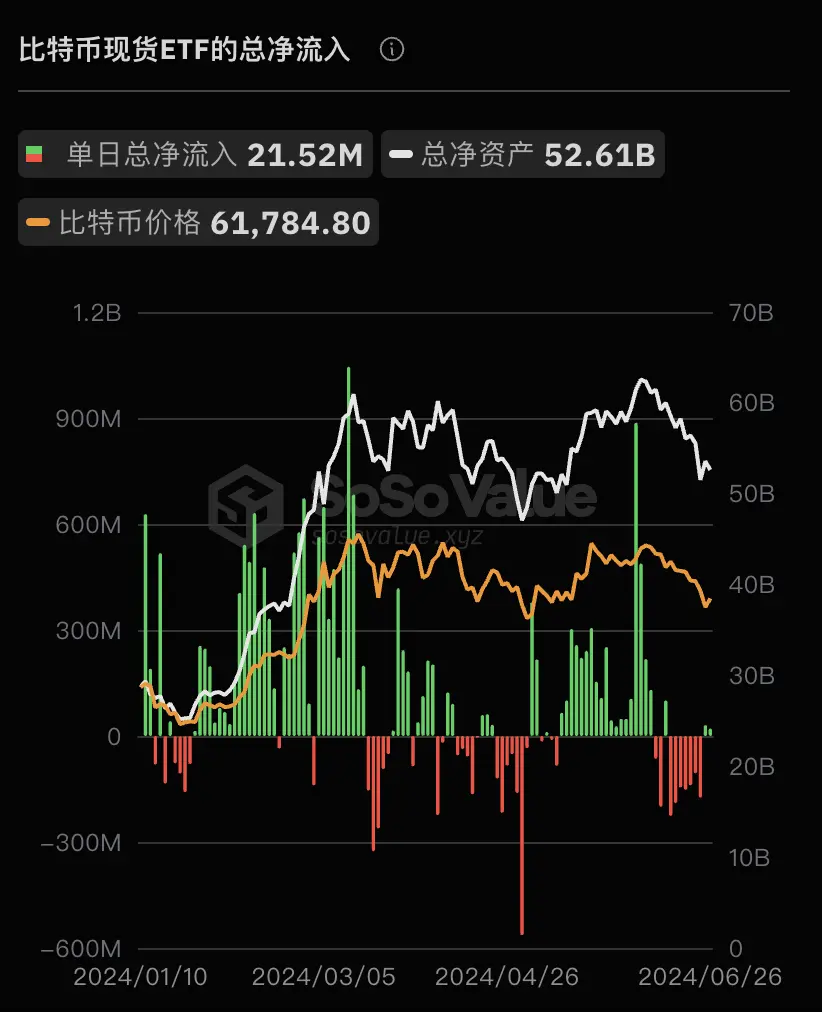 ChainCatcher message, according to SoSoValue data, yesterday (Eastern Time June 26) the total net inflow of Bitcoin spot ETFs was $21.5187 million. Yesterday, Grayscale ETF GBTC had a net inflow of $4.3306 million, and the historical net outflow of GBTC is $18.476 billion.