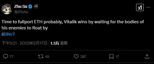 ChainCatcher news, Zhu Su, co-founder of Three Arrows Capital (3AC), posted on X stating "It's time to go all in on ETH, Vitalik is using stillness to counter movement, waiting for the enemy's corpses to float by with the water."