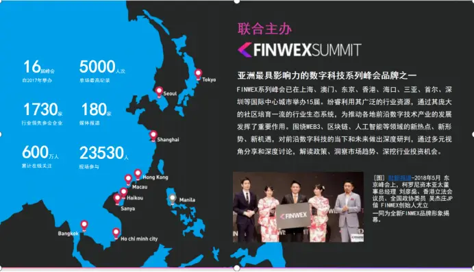 The FINWEX series of summits has been held 16 times in international hub cities such as Shanghai, Macau, Tokyo, Hong Kong, Haikou, Sanya, Seoul, and Shenzhen. Finrui utilizes its extensive industry resources to cultivate a first-class industry ecosystem through its large community, playing an important role in promoting the development of cutting-edge digital technology industries in various regions.