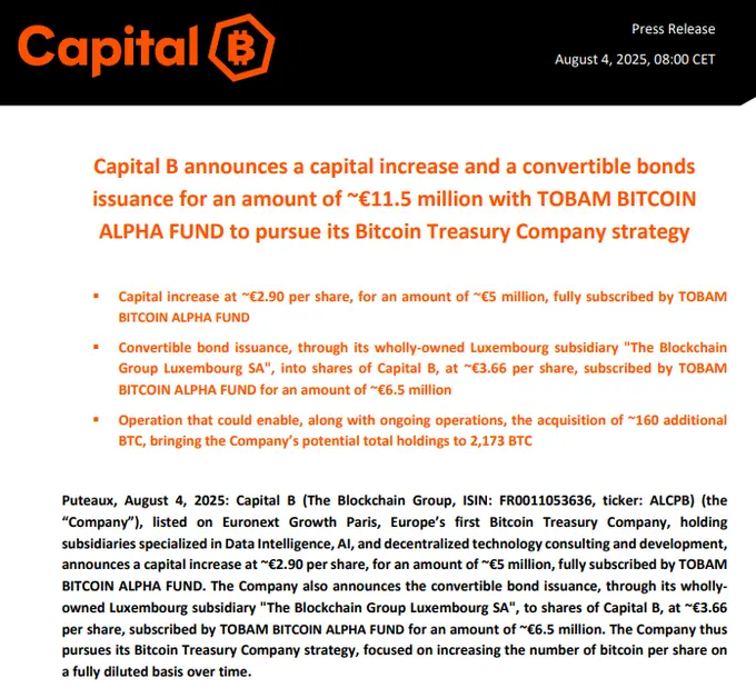 European listed company Capital B announced the raising of $13.3 million in funds to increase its holdings in Bitcoin