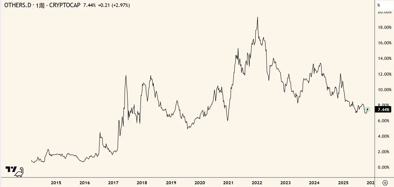 In the traditional four-year cycle, BTC reaching new highs after halving often coincides with capital flowing into the altcoin market, triggering a comprehensive market climax akin to "Alt Season." Historically, this phase typically marks an extreme expansion of risk appetite in the latter stages of a bull market. However, in this cycle, this classic chain reaction has not occurred—BTC has already broken through historical highs early, but the expected "sector resonance" has not materialized, with altcoins performing significantly below historical levels. The chart below shows that since the end of 2021, the market cap share of altcoins has continuously declined, and even during BTC's new high phase, there has been no historical typical "Altcoin Dominance rebound," further validating the trend of market capital concentration and narrative dispersion.