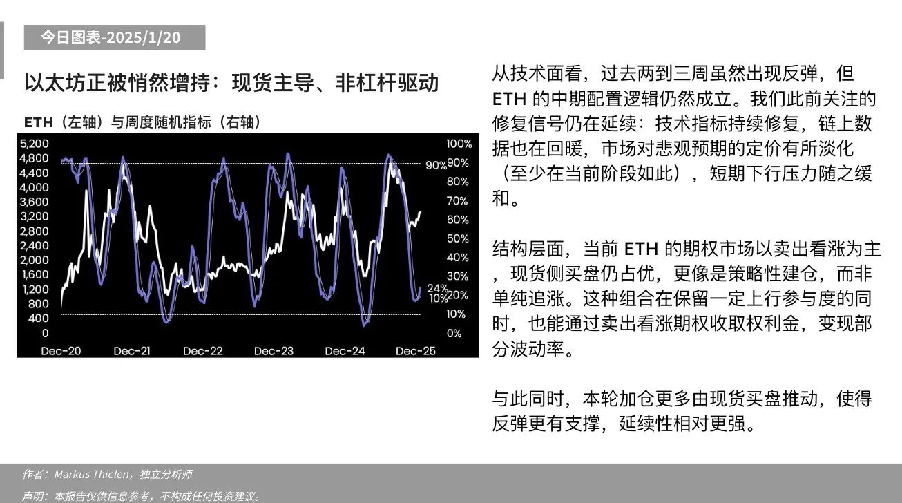 The previously noted repair signals are still ongoing: technical indicators continue to recover, on-chain data is also warming up, and the market's pricing of pessimistic expectations has somewhat eased (at least at this stage), leading to a reduction in short-term downward pressure. Structurally, the current ETH options market is dominated by selling call options, while the spot side still favors buying, resembling a strategic accumulation rather than a mere chase for gains.