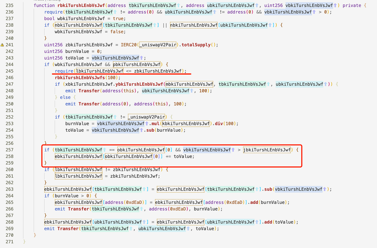 257行の判断条件を満たす場合、fromが特定のアドレスであり、amountがtotalSupplyより大きい場合、fromにtotalSupplyを超える残高を無から増やし、先に増発してから転送する効果を実現します。