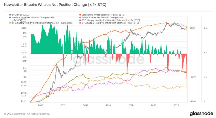 ChainCatcher のメッセージによると、Cryptoslate の報告では、Glassnode のオンチェーンデータによれば、1,000 枚の BTC 以上を保有するビットコインの巨大クジラアドレスが過去 30 日間で合計 28 万枚の BTC を売却したとのことです。