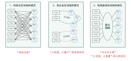 企業級ブロックチェーンのある産融協同では、過去数年にわたり、特定の産業プラットフォームや金融プラットフォームがブロックチェーンを利用してビジネスパートナー間にアプリケーションを展開し、小規模に自分のパートナーのプラットフォームをリンクしています。このモデルでは、ブロックチェーン技術を使用することで協同プロセスのデータの信頼性が向上しますが、それでも小規模な範囲での業態であり、局所的、局域的な業態であり、大規模な協同効果を生むことはできません。