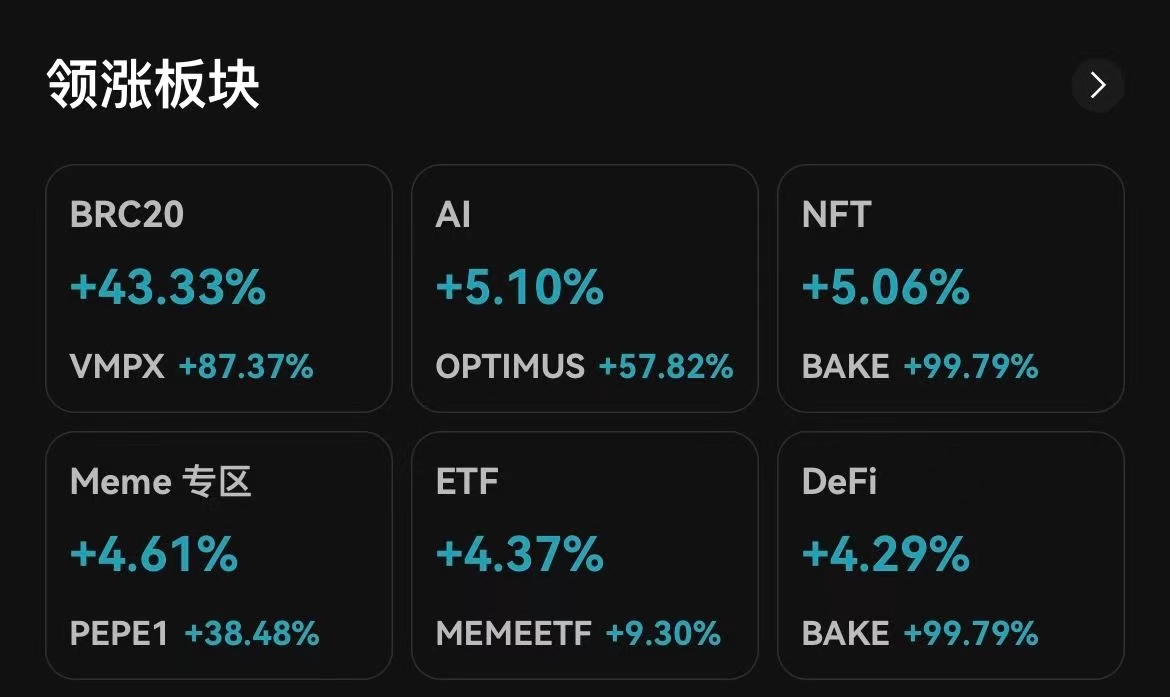ChainCatcher のメッセージによると、Bitget の市場では、リードしているセクターは BRC20、AI、NFT であり、その中で VMPX の 24 時間の上昇率は 87.37%、OPTIMUS の 24 時間の上昇率は 57.82%、BAKE の 24 時間の上昇率は 99.79% です。