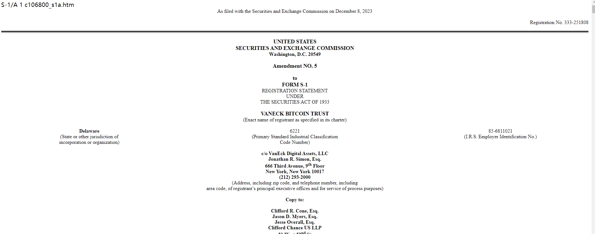 VanEckはそのビットコイン現物ETF申請にS-1修正案を提出しました。