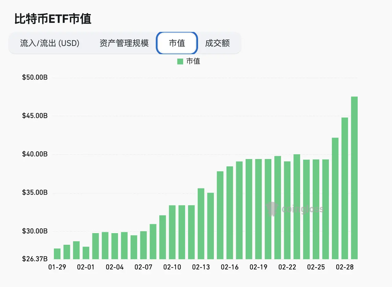 ETFの資金流入の観点から見ると、上昇期間とETF資金流入が重なっており、ETFがビットコイン価格を押し上げる役割を果たしています。29日時点で、11本のETFの累計管理規模は422.38億ドルに達し、保有資産の時価総額はビットコインの総時価総額の3.81%を占めています。このデータは、バイナンス取引所のウォレットアドレスが保有するビットコインの数量を上回っています。