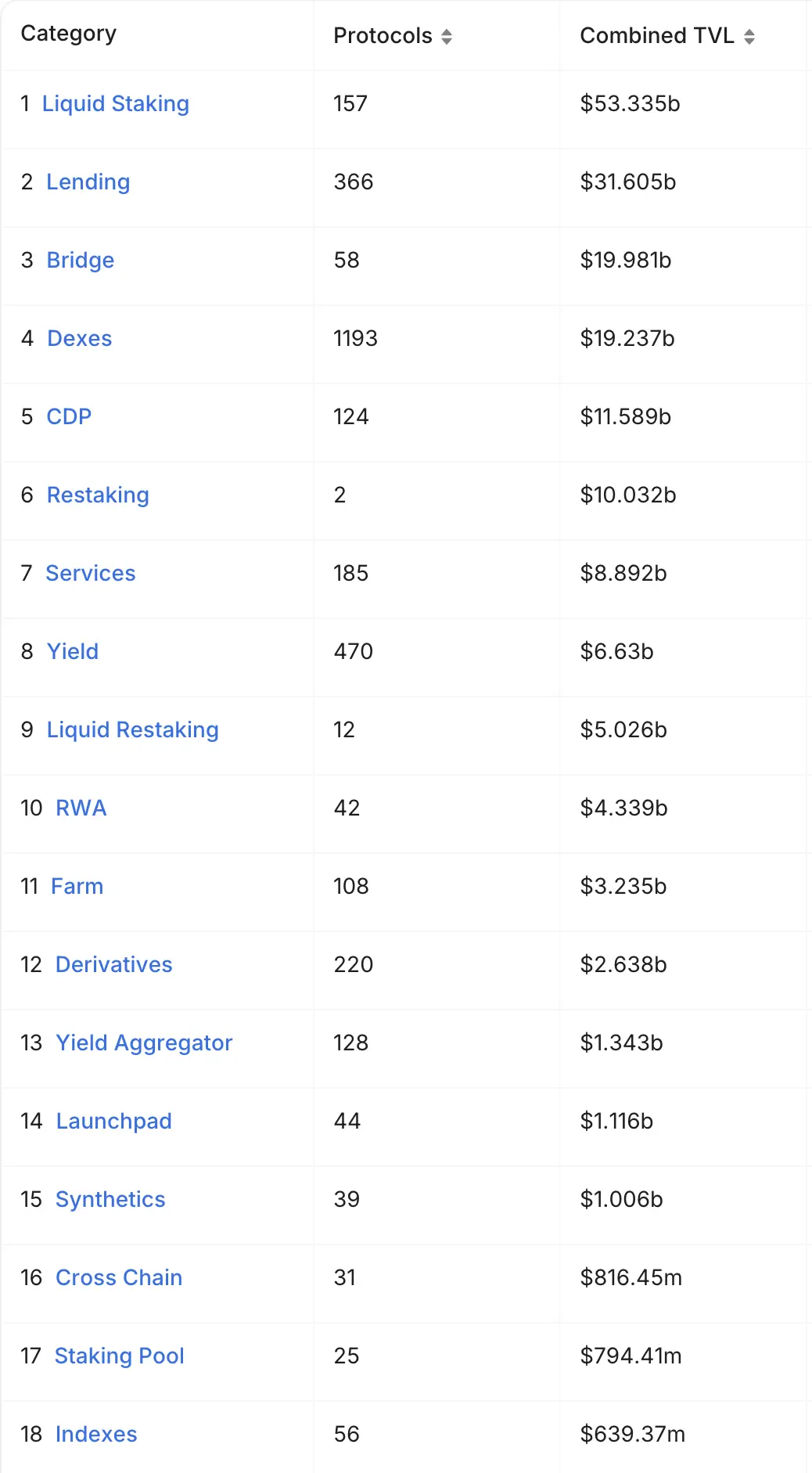 DeFiカテゴリ別に見ると、TVLランキングの最上位は依然としてLSDセクターで、約533億ドルです;LSDプロジェクトに基づくRestakingプロジェクトは合計約100億ドル;Restakingに基づくLRTプロジェクトは合計約50億ドルです。