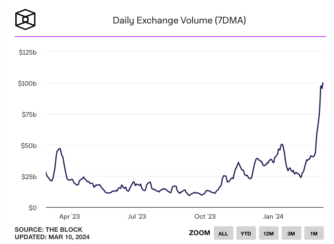 最近1週間、BTC価格が70000ドルの大台を突破し、歴史的な新高値を記録しました;ETH価格も3900ドルを突破し、2022年1月4日以来の最高点に達しました;CEXの日取引量が1000億ドルに近づき、アメリカのBTC現物ETFの日取引量が100億ドルの歴史を更新する中、全体の暗号市場の活発度が明らかに増加しています。