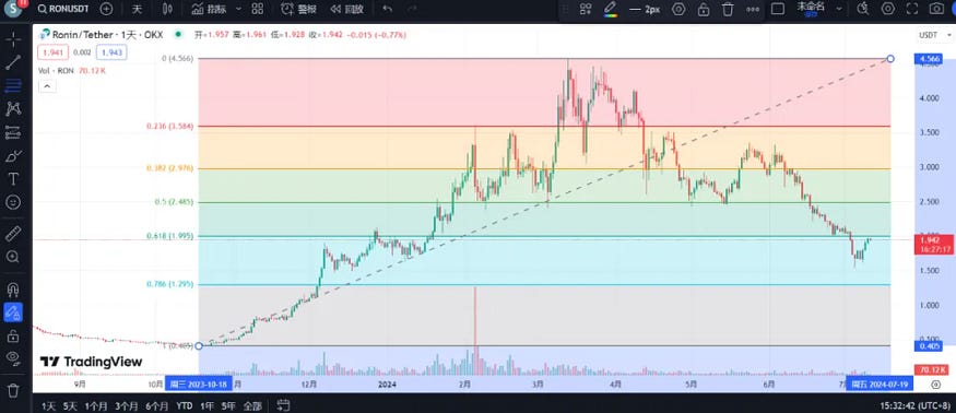 RoninはGameFi分野のプロジェクトで、Axie Infinityの開発者Sky Mavisによって構築されたイーサリアムのサイドチェーンで、EVM互換のスマートコントラクトとプロトコルをサポートしています。昨年(2023)2月の話李話外の記事で言及しました。このプロジェクトのトークンRONは2022年にローンチされ、ベアマーケットを経て、価格は0.2ドル付近から4.45ドルに上昇し、歴史的な新高値を突破しましたが、現在は1.9ドル付近に調整しています。Market Cap / FDV = 0.34です。チャートを見ると、現段階でもほぼ底値に達しているようです。以下の図をご覧ください。