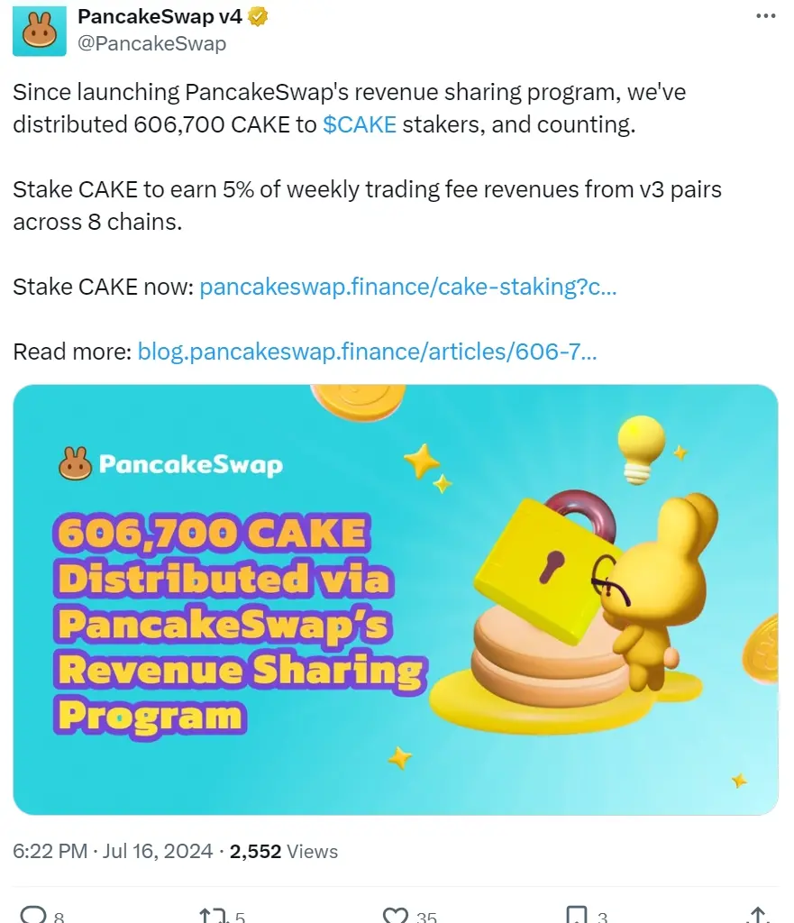 ChainCatcher のメッセージ、PancakeSwap は X において、PancakeSwap の収益共有プログラムを開始して以来、チームが CAKE ステーキング者に 606,700 枚の CAKE を配布したと発表しました。また、これは増加し続けています。ユーザーは 8 つのチェーン上の v3 取引ペアを通じて、毎週 5% の取引手数料収入を得ることができます。