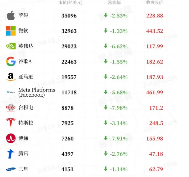 時価総額の大きい「七大巨頭」はすべて下落し、その中でエヌビディア (NVDA.O) が最も大きく、6.6% 以上の下落を記録し、アップル (AAPL.O) は 2.5% 下落しました。「七大巨頭」の時価総額は、1 日で約 5800 億ドル(約 4.21 兆人民元)が消失しました。