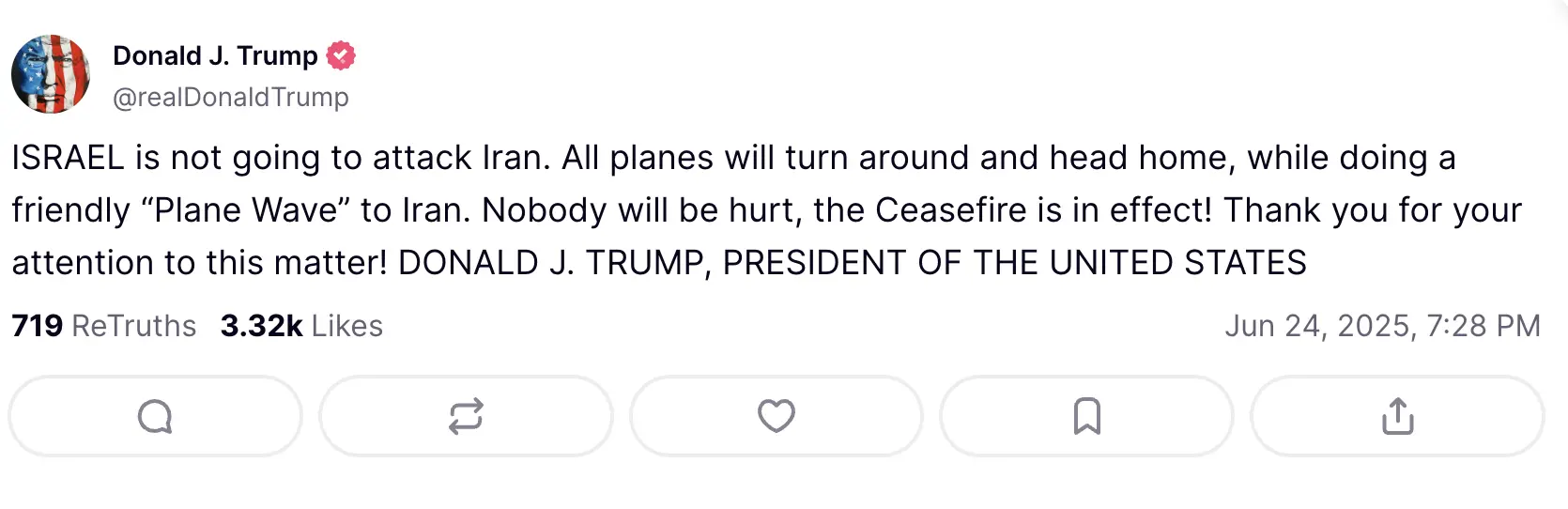 ChainCatcher メッセージ、アメリカのトランプが Truth Social でメッセージを発表しました。「イスラエルはイランに攻撃を仕掛けない、すべての飛行機は帰還する。誰も傷つくことはない、停戦は発効した。」