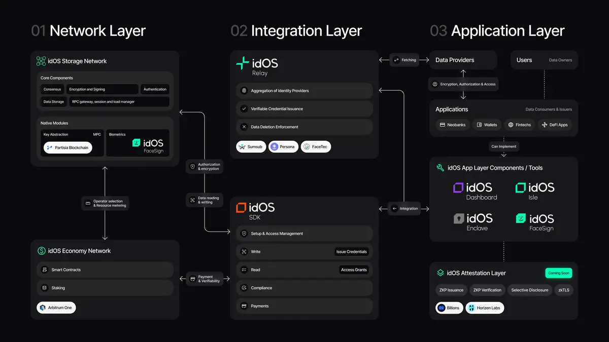 idOSは分散型アイデンティティネットワークを通じてユーザーデータの自主管理と制御可能な共有を実現し、従来のインターネットにおけるデータのプラットフォーム独占の問題を解決します。そのアーキテクチャは分散型ストレージ、エンドツーエンドの暗号化、検証可能な証明メカニズムを組み合わせ、ユーザーが異なるアプリケーション間でアイデンティティデータを持ち運び、再利用できるようにし、Web3アプリケーションにおけるKYC、コンプライアンス、ユーザーオンボーディングのコストを削減します。また、idOSはストレージネットワークと将来の経済ネットワークの階層設計を通じて、ステーブルコイン、金融サービス、クロスプラットフォームアプリケーションに統一されたアイデンティティインフラを提供し、強いエコシステムの拡張潜力を持っています。