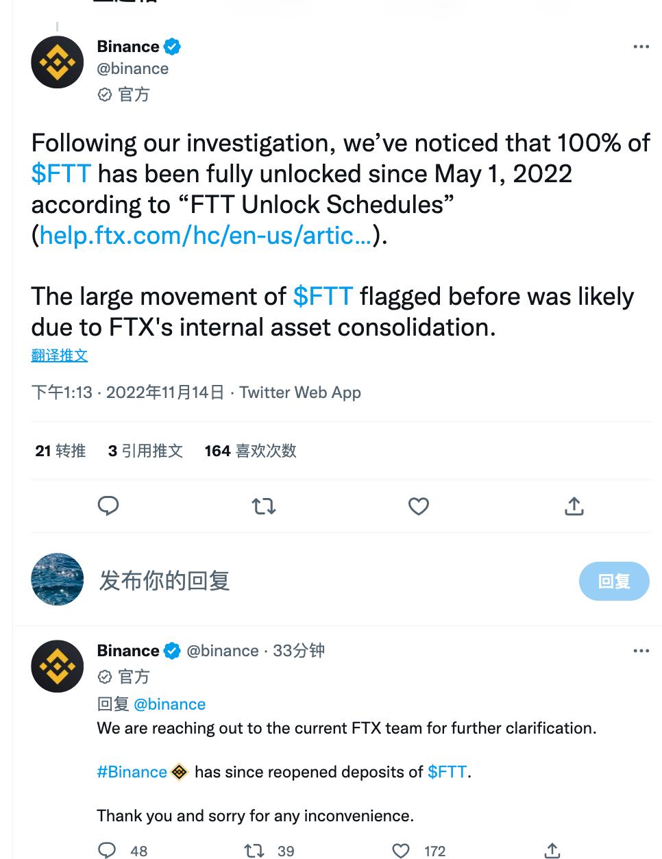 ChainCatcher 메시지, 바이낸스는 공식 트위터에서 "우리는 FTT 잠금 해제 일정에 따라 2022년 5월 1일 이후 100%의 FTT가 완전히 잠금 해제된 것을 확인했습니다. 이전에 발생한 FTT 대규모 이동은 FTX의 내부 자산 통합으로 인한 것일 가능성이 높습니다. 우리는 현재 FTX 팀과 연락하여 추가적인 설명을 요청하고 있습니다. 바이낸스는 FTT의 재충전을 다시 열었습니다."라고 밝혔습니다.