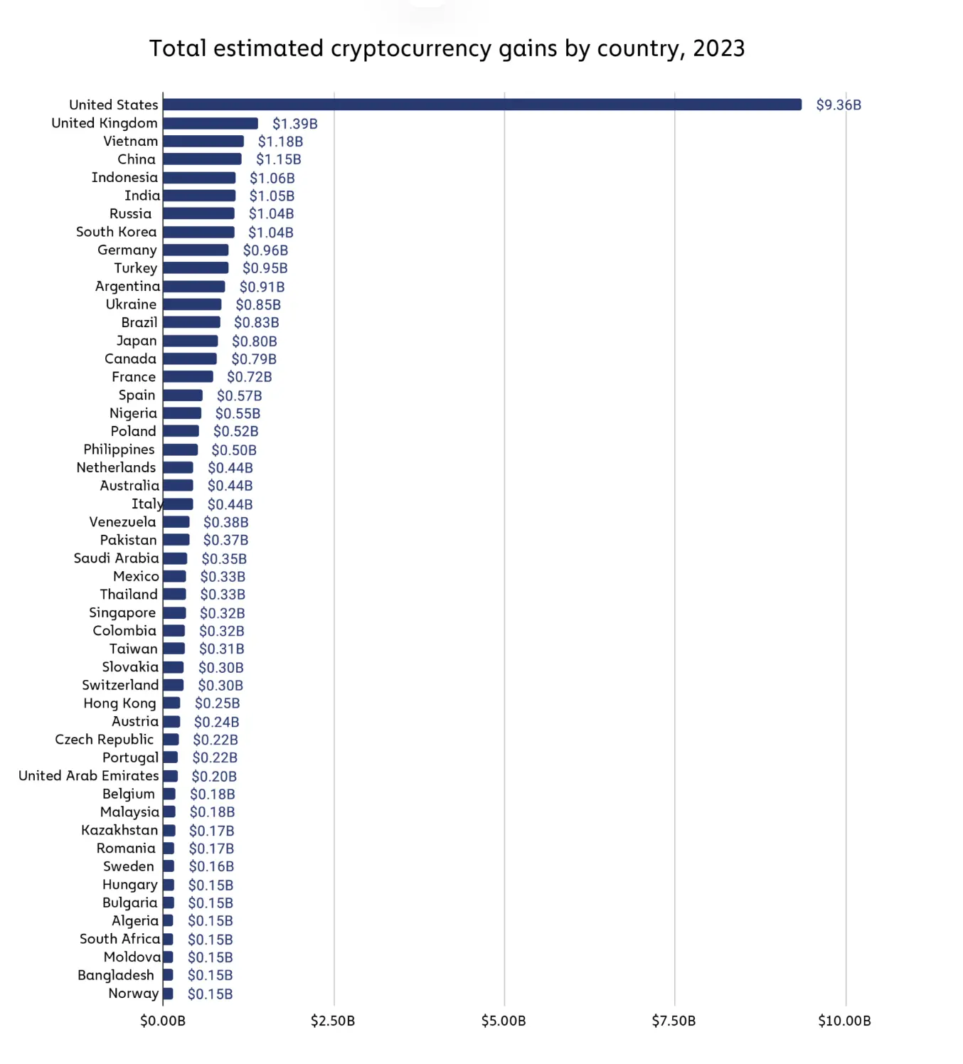 2023년, 미국은 암호화폐 수익에서 93.6억 달러로 압도적인 선두를 차지하고 있으며, 영국은 약 13.9억 달러로 두 번째입니다.