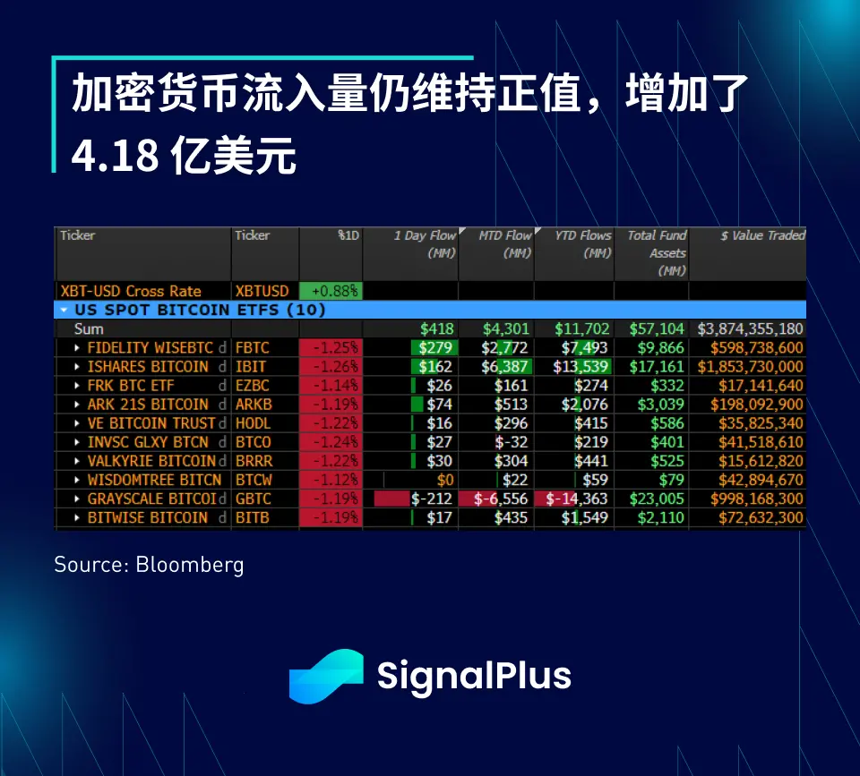암호화폐 분야에서는 뉴욕 개장 시 가격 변동이 있었습니다. BTC 가격이 7.2만 달러에 가까이 급등한 후 6.85만 달러의 저점으로 반전하였고, Coinbase 주가도 개장 시 변동이 있었습니다(몇 분 내에 267 --> 278 --> 256 달러로 변동). 이러한 변동은 미국 지역 판사가 SEC의 Coinbase에 대한 소송을 계속 진행할 수 있다고 판결한 것에 기인할 수 있으며, Coinbase는 등록되지 않은 증권 판매를 한 혐의를 받고 있습니다. 어제 Coinbase 주가는 2.5% 하락하며 BTC 가격에 압박을 가했지만, ETF 순유입은 여전히 긍정적이며 어제 4.18억 달러의 자금이 증가했습니다.
