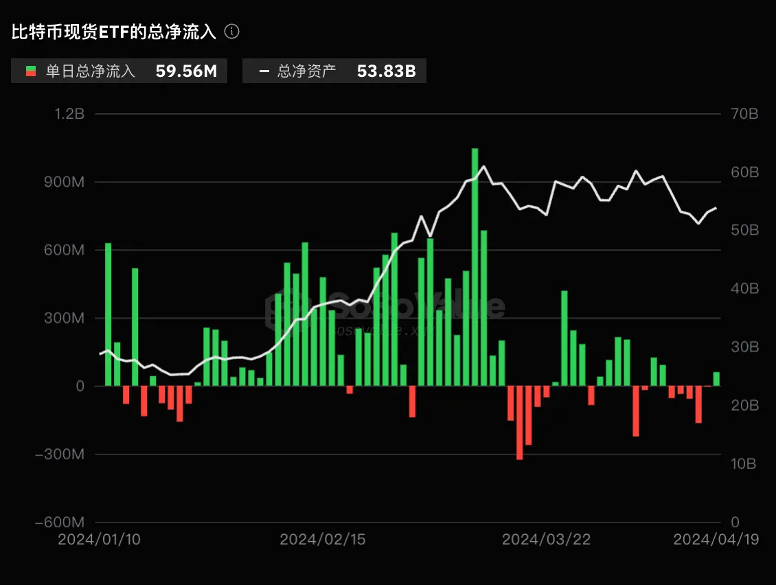 데이터: 비트코인 현물 ETF 어제 총 순유입 5955.80만 달러, 지난 5일 순유출 후 처음으로 순유입