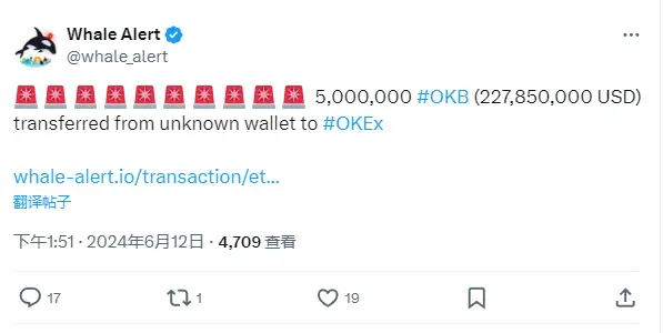 ChainCatcher 메시지에 따르면, Whale Alert가 모니터링한 결과, 5,000,000 개의 OKB (가치 227,850,000 달러)가 알려지지 않은 지갑에서 OKX로 전송되었습니다.