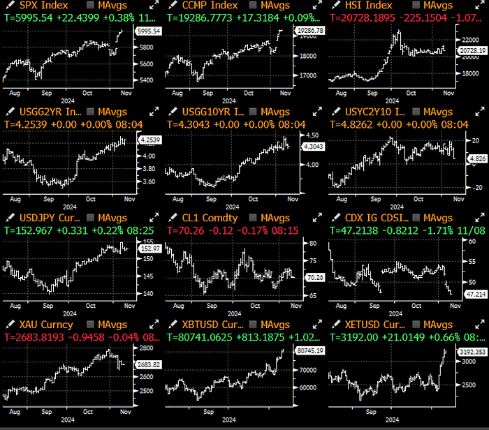 트럼프가 당선된 후 공식 취임까지 2개월이 남았지만, 그의 승리의 영향은 이미 지정학적 및 자본 시장에서 광범위하게 나타나고 있습니다. 암호화폐가 다시 주목받고 있으며, 미국 일부 지역에서 투표 집계가 완료되지 않은 가운데 BTC 가격은 8만 달러를 돌파했습니다. 블랙록의 BTC ETF (IBIT)는 지난 목요일 11억 달러의 단일일 자금 유입 기록을 세웠고, ETH ETF도 역사상 세 번째로 높은 단일일 자금 유입을 기록했습니다.