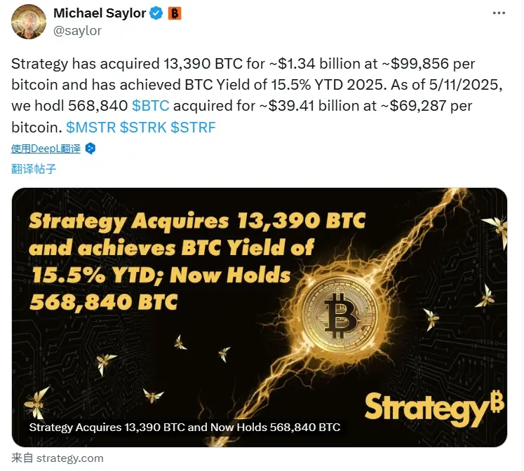 ChainCatcher 메시지에 따르면, 공식 소식에 따르면 Strategy는 5월 5일부터 5월 11일 사이에 13,390개의 비트코인을 매입했으며, 평균 구매가는 99,856달러입니다. 2025년 현재 비트코인 수익률은 15.5%에 달합니다.