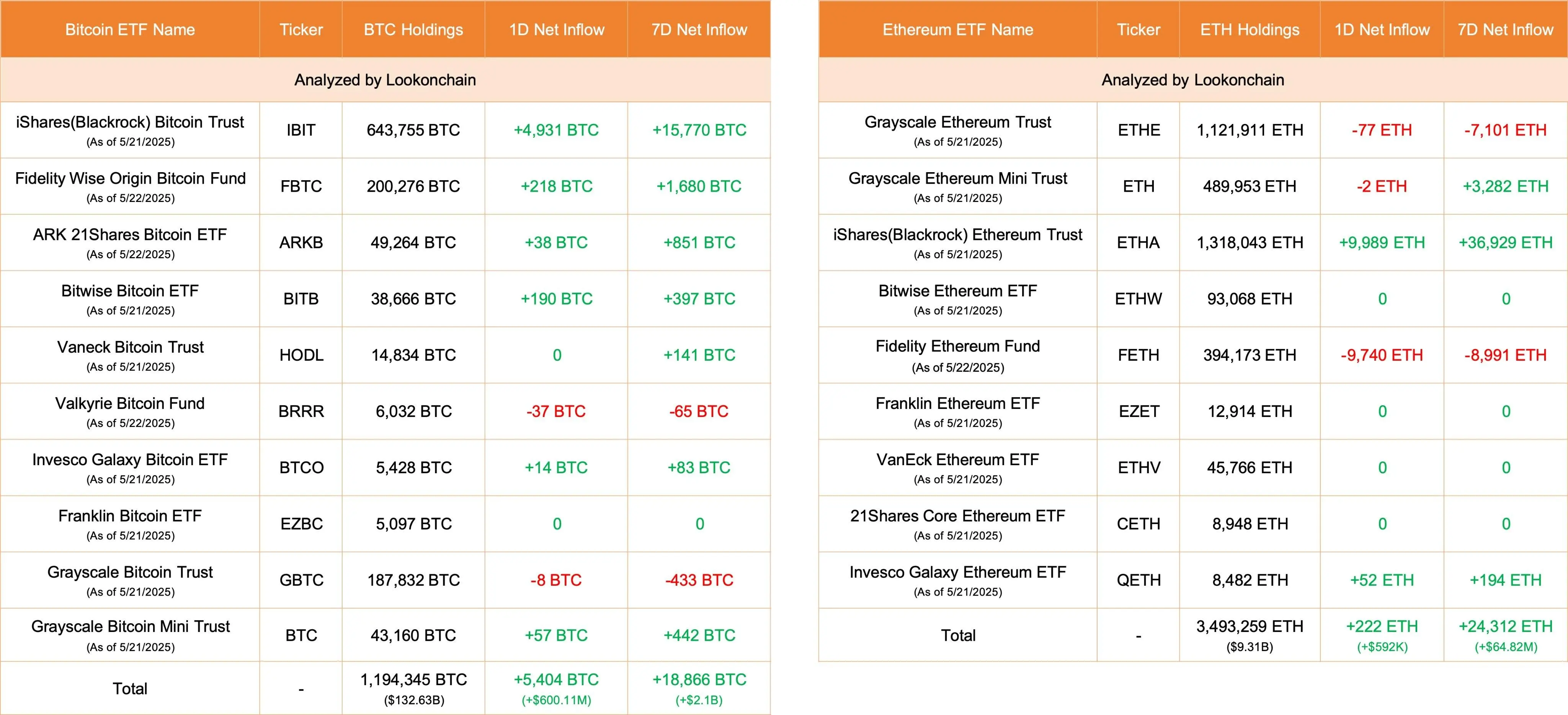 데이터: 오늘 미국 비트코인 ETF 순유입 5,404 BTC, 이더리움 ETF 순유입 222 ETH