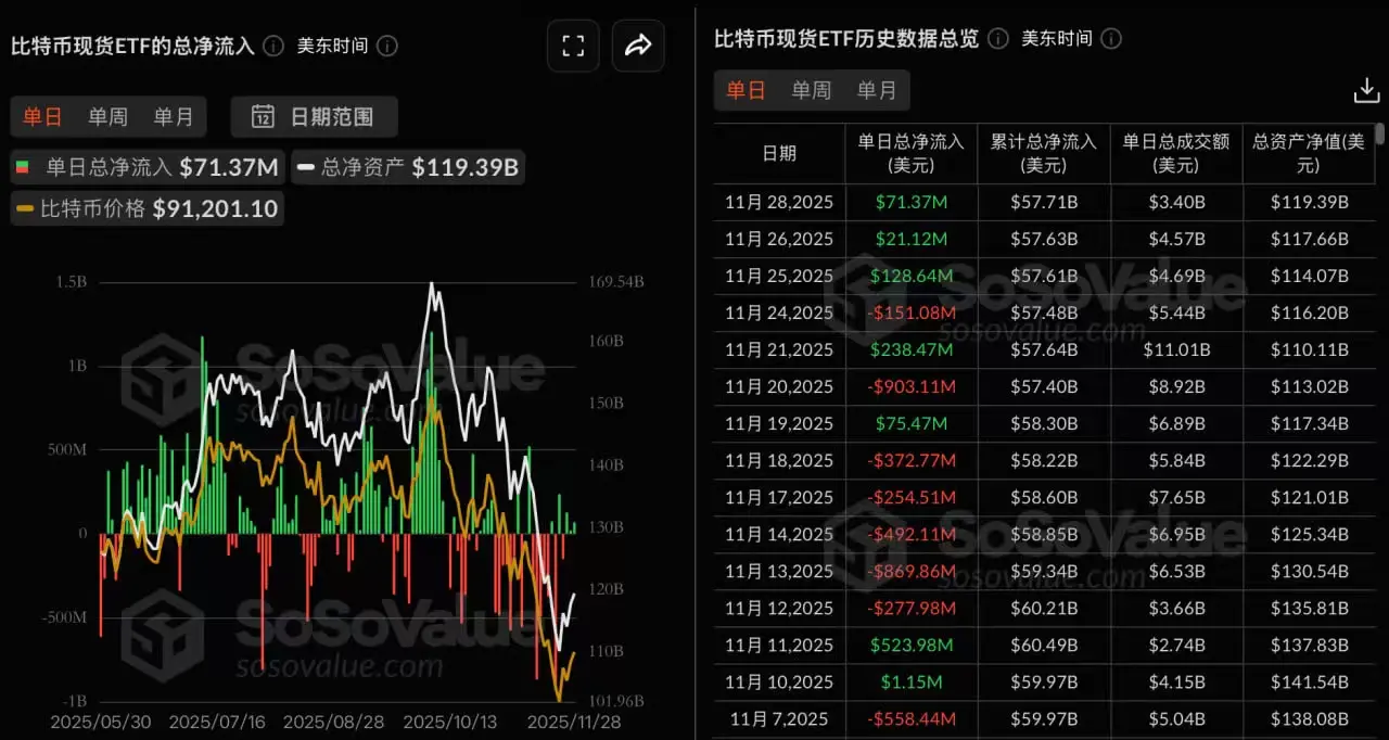 根据 SoSoValue 数据,昨日(美东时间 11 月 28 日)比特币现货 ETF 总净流入 7137.10 万美元。