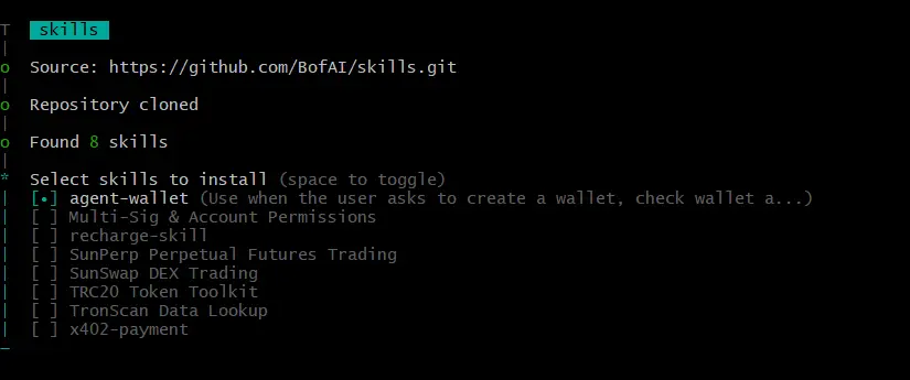 복제가 완료되면 터미널이 자동으로 현재 지원되는 8개의 핵심 Skills를 스캔하여 나열합니다. 위아래 방향키를 사용하여 탐색하고, 스페이스바를 눌러 선택하거나 선택 해제하며, Enter 키를 눌러 선택을 확인할 수 있습니다. B.AI가 현재 제공하는 Skills는 다음과 같습니다: