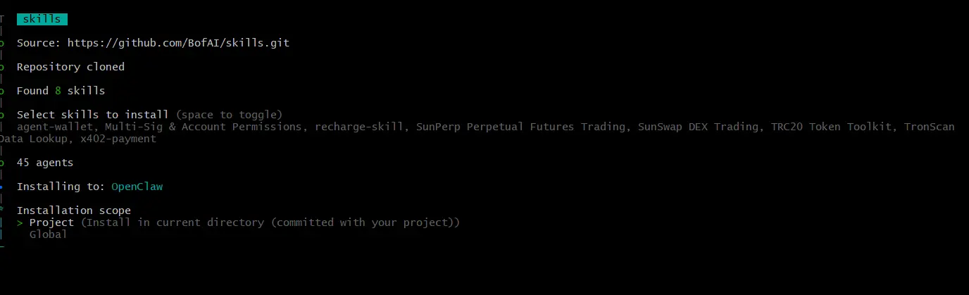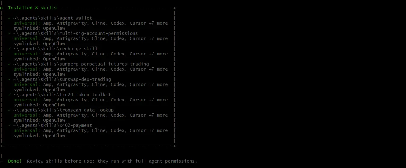 Skills가 서로 독립적이면서도 원활하게 조합될 수 있는 "레고" 특성 덕분에 사용자는 AI에게 여러 단계를 포함하는 복합 작업을 지시할 수 있으며, AI는 다양한 구성 요소를 자율적으로 호출하여 폐쇄 루프를 완성할 수 있습니다. 예를 들어, "먼저 내 주소(주소 입력)를 확인하여 현재 USDT 잔액이 얼마인지 확인하고, 현재 SunSwap의 최적 환율에 따라 내 모든 TRX를 USDT로 교환하면 대략 얼마가 될지 계산해 주세요."