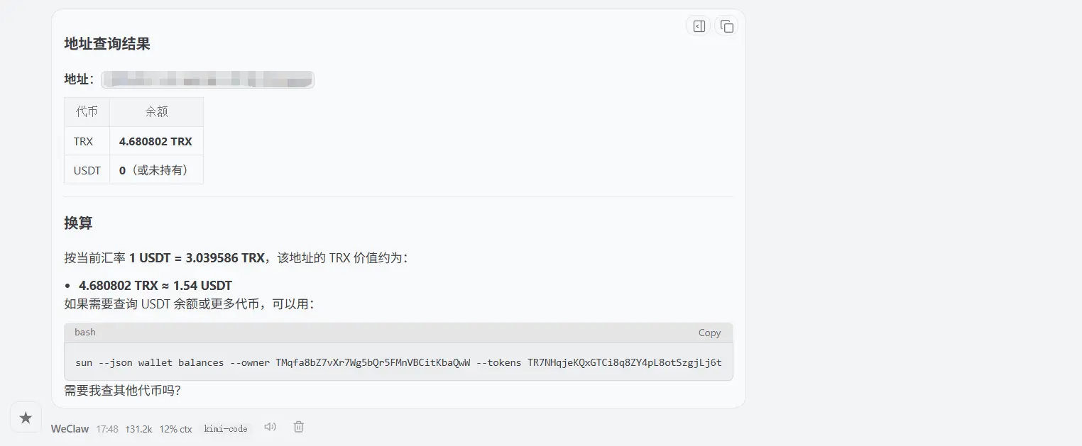 가장 인간의 직관에 부합하는 상호작용 방식입니다. 사용자는 구체적인 기본 코드 파일을 언급할 필요 없이, 인간 비즈니스 어시스턴트에게 지시하듯이 최종 요구 사항을 직접 말하면 됩니다. 예를 들어, "현재 SunSwap에서 USDT를 TRX로 교환하는 실시간 환율이 얼마인지 확인해 주세요." OpenClaw는 자연어 지침을 수신한 후, 백그라운드에서 정확하게 관련 Skill을 매칭하고 활성화합니다. 이후 관련 인터페이스를 자동으로 호출하여 최종 결과를 직접 보고합니다.