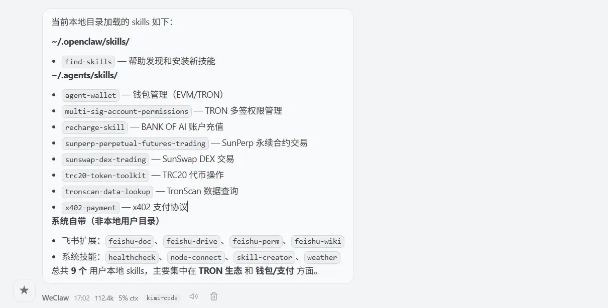 복잡한 작업을 실행하기 전에 방금 설치한 도구가 효과가 있는지 확인하고 싶다면, 자연어로 AI에게 "점검"을 요청할 수 있습니다. 예를 들어, "현재 로컬 디렉토리에 어떤 Skills가 로드되어 있는지 확인해 주세요." OpenClaw는 자동으로 확인하고 sunswap-dex-trading, agent-wallet, tronscan-data-lookup 등 배포된 핵심 모듈을 나열합니다.