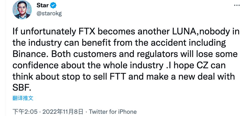 ChainCatcher 消息,OKGroup 創始人徐明星表示," 如果 FTX 不幸成為另一個 LUNA,業內沒有人可以從中這次事故中受益,包括幣安。客戶和監管機構都將對整個行業失去一些信心。我希望 CZ 能考慮停止出售 FTT,並與 SBF 達成新的協議。"