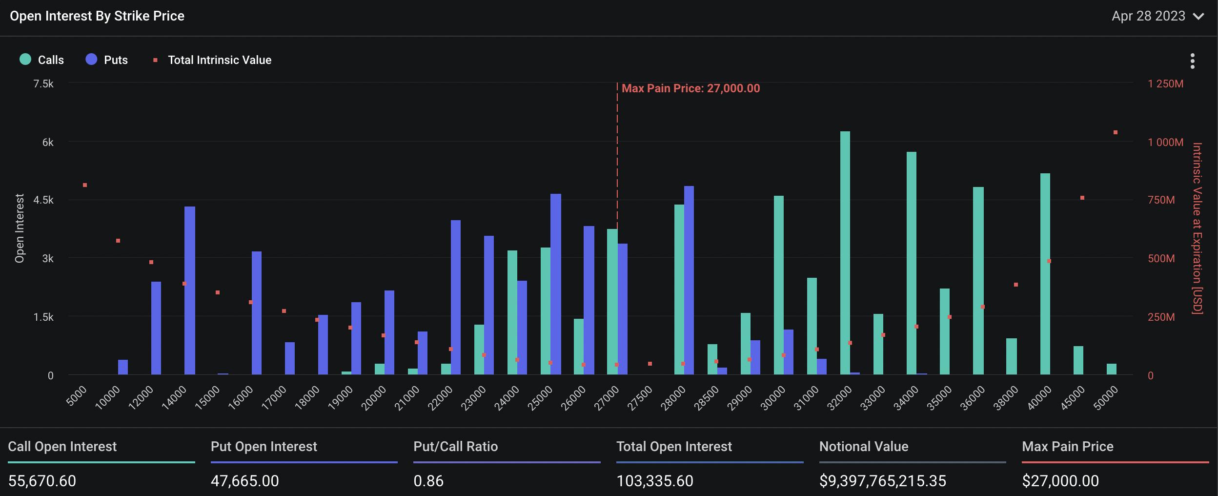 ChainCatcher 消息,据 Deribit 資料,4 月 28 日將有價值約 28.5 億美元的比特幣期權合約到期,最大痛點為 27000 美元。其中,看漲期權超過 5.5 萬張,看跌期權 4.7 萬張,空多比為 0.86。