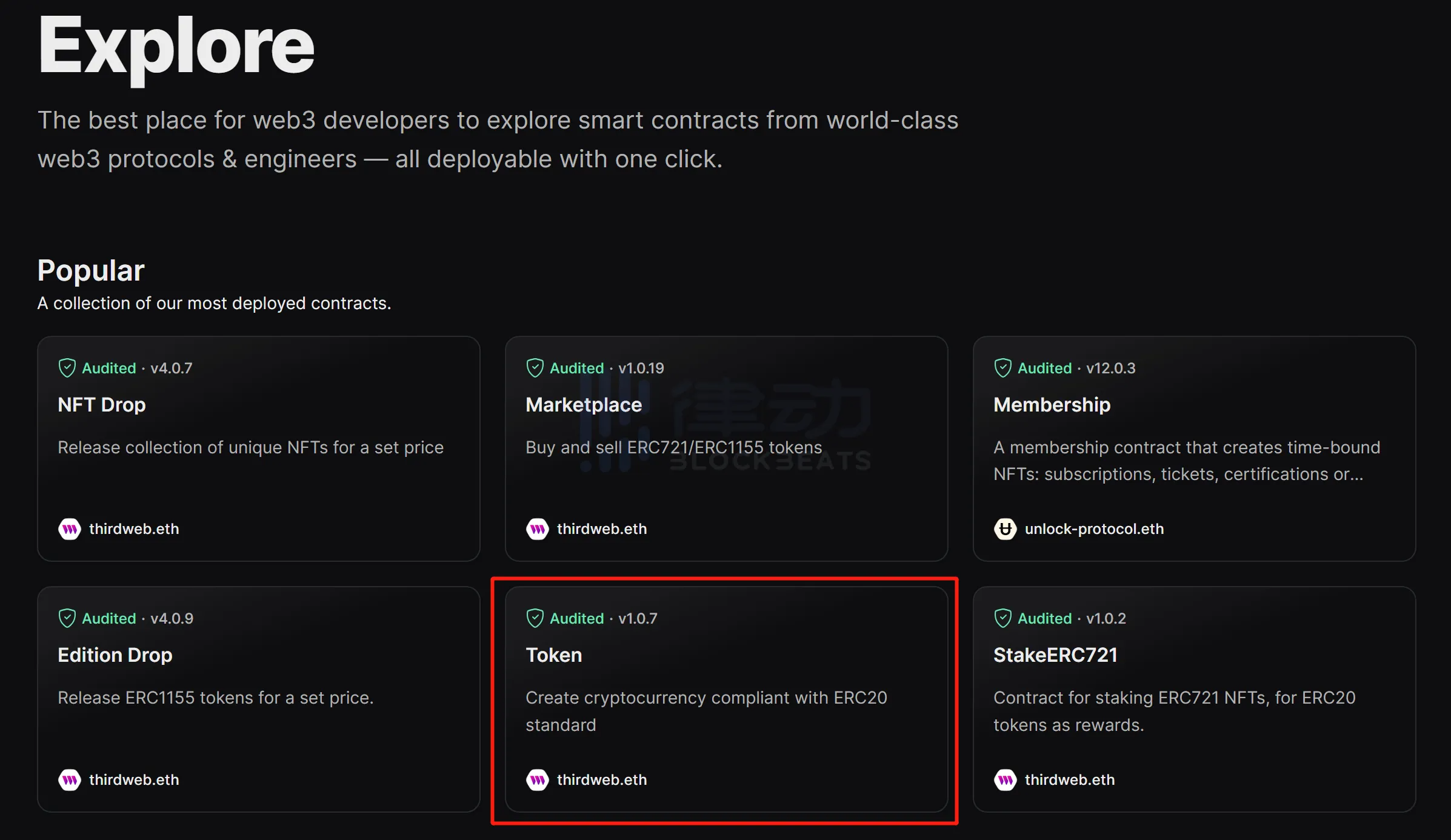 接著我們可以選擇要部署的合約類型。這裡可供選擇的類型很多,無代碼一鍵部署 ERC-20、ERC-721、ERC-1155 Token 都是支持的,甚至支持部署一個帶質押功能的 ERC-721 Token、可租借的 NFT ERC-4907 乃至像 OpenSea 那樣的交易市場等等。這裡我只是簡單的部署一個 ERC-20 Token,所以選擇「Token」:
