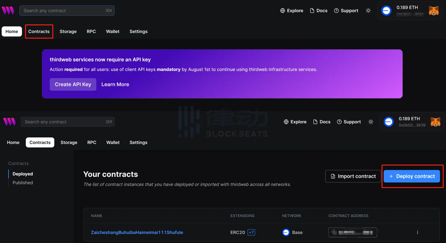 在 Thirdweb 上連接錢包並簽名後,點擊「Contracts」,再點擊「Deploy contract」。