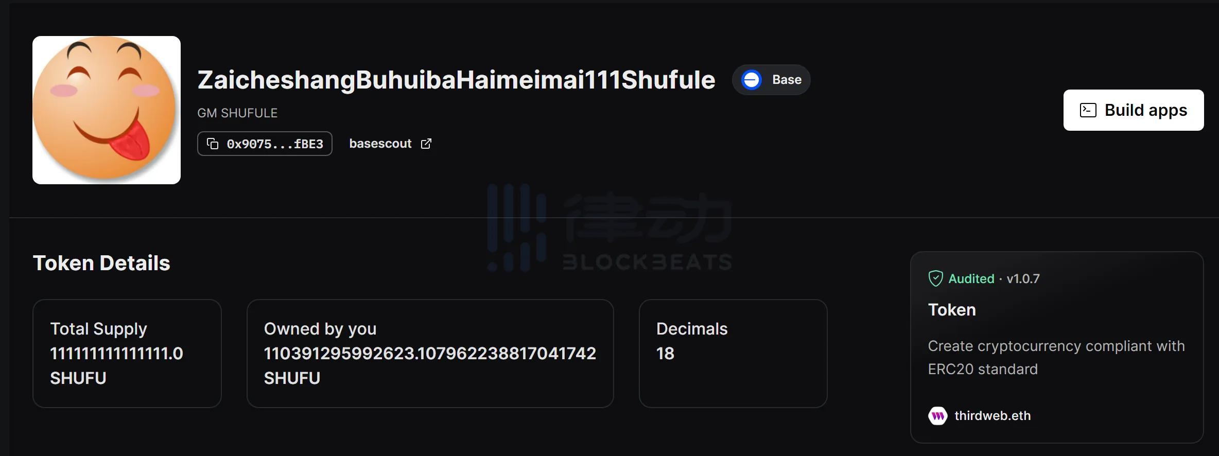 我設置的「Name」是「ZaicheshangBuhuibaHaimeimai111Shufule」,「Sybmol」是 SHUFU,「Description」是「GM SHUFULE」,「Image」則是一個舒服了的贴吧表情包。花費 2.26 美元成功部署後,效果如下: